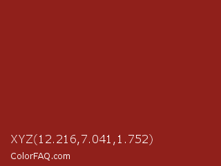 XYZ 12.216,7.041,1.752 Color is a normal red color and the nearest color is Old Brick #901e1e. Hex code #90201b and RGB value is rgb(144,32,27). In RGB color space, this color is composed of 56% red, 13% green, 11% blue, In CMYK color space, this color is composed of 0% cyan, 78% magenta, 81% yellow , 44% black , In HSL color space, this color has a hue angle of 3° , 68% saturation and 34% lightness.