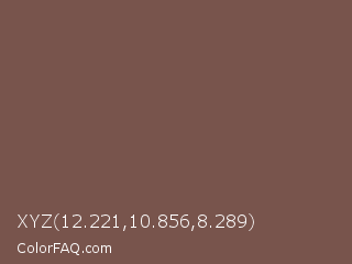 XYZ 12.221,10.856,8.289 Color is a normal red color and the nearest color is Roman Coffee #795d4c. Hex code #78544c and RGB value is rgb(120,84,76). In RGB color space, this color is composed of 47% red, 33% green, 30% blue, In CMYK color space, this color is composed of 0% cyan, 30% magenta, 37% yellow , 53% black , In HSL color space, this color has a hue angle of 11° , 22% saturation and 38% lightness.