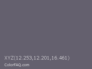 XYZ 12.253,12.201,16.461 Color is a normal indigo color and the nearest color is Salt Box #685e6e. Hex code #64606e and RGB value is rgb(100,96,110). In RGB color space, this color is composed of 39% red, 38% green, 43% blue, In CMYK color space, this color is composed of 9% cyan, 13% magenta, 0% yellow , 57% black , In HSL color space, this color has a hue angle of 257° , 7% saturation and 40% lightness.