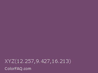 XYZ 12.257,9.427,16.213 Color is a normal magenta color and the nearest color is Twilight Lavender #8a496b. Hex code #73486f and RGB value is rgb(115,72,111). In RGB color space, this color is composed of 45% red, 28% green, 44% blue, In CMYK color space, this color is composed of 0% cyan, 37% magenta, 3% yellow , 55% black , In HSL color space, this color has a hue angle of 306° , 23% saturation and 37% lightness.