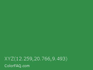 XYZ 12.259,20.766,9.493 Color is a normal green color and the nearest color is Sea Green #2e8b57. Hex code #318f48 and RGB value is rgb(49,143,72). In RGB color space, this color is composed of 19% red, 56% green, 28% blue, In CMYK color space, this color is composed of 66% cyan, 0% magenta, 50% yellow , 44% black , In HSL color space, this color has a hue angle of 135° , 49% saturation and 38% lightness.