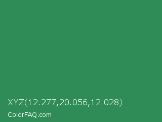 XYZ 12.277,20.056,12.028 Color is a normal green color and the nearest color is Sea Green #2e8b57. Hex code #308c56 and RGB value is rgb(48,140,86). In RGB color space, this color is composed of 19% red, 55% green, 34% blue, In CMYK color space, this color is composed of 66% cyan, 0% magenta, 39% yellow , 45% black , In HSL color space, this color has a hue angle of 145° , 49% saturation and 37% lightness.