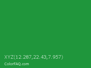 XYZ 12.287,22.43,7.957 Color is a normal green color and the nearest color is North Texas Green #059033. Hex code #1f963c and RGB value is rgb(31,150,60). In RGB color space, this color is composed of 12% red, 59% green, 24% blue, In CMYK color space, this color is composed of 79% cyan, 0% magenta, 60% yellow , 41% black , In HSL color space, this color has a hue angle of 135° , 66% saturation and 35% lightness.