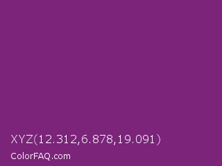 XYZ 12.312,6.878,19.091 Color is a normal magenta color and the nearest color is Midnight #702670. Hex code #7b247a and RGB value is rgb(123,36,122). In RGB color space, this color is composed of 48% red, 14% green, 48% blue, In CMYK color space, this color is composed of 0% cyan, 71% magenta, 1% yellow , 52% black , In HSL color space, this color has a hue angle of 301° , 55% saturation and 31% lightness.
