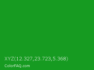 XYZ 12.327,23.723,5.368 Color is a normal green color and the nearest color is Forest Green #228b22. Hex code #169b21 and RGB value is rgb(22,155,33). In RGB color space, this color is composed of 9% red, 61% green, 13% blue, In CMYK color space, this color is composed of 86% cyan, 0% magenta, 79% yellow , 39% black , In HSL color space, this color has a hue angle of 125° , 75% saturation and 35% lightness.