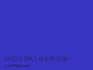 XYZ 12.329,7.014,50.573 Color is a normal indigo color and the nearest color is Governor Bay #2f3cb3. Hex code #3833c0 and RGB value is rgb(56,51,192). In RGB color space, this color is composed of 22% red, 20% green, 75% blue, In CMYK color space, this color is composed of 71% cyan, 73% magenta, 0% yellow , 25% black , In HSL color space, this color has a hue angle of 242° , 58% saturation and 48% lightness.