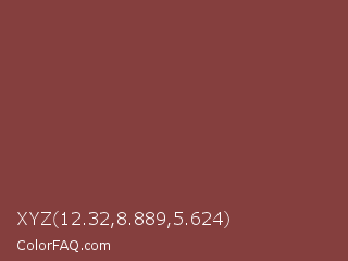 XYZ 12.32,8.889,5.624 Color is a normal red color and the nearest color is Lotus #863c3c. Hex code #853f3e and RGB value is rgb(133,63,62). In RGB color space, this color is composed of 52% red, 25% green, 24% blue, In CMYK color space, this color is composed of 0% cyan, 53% magenta, 53% yellow , 48% black , In HSL color space, this color has a hue angle of 1° , 36% saturation and 38% lightness.
