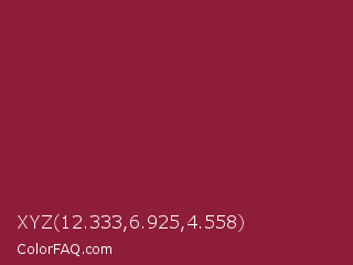XYZ 12.333,6.925,4.558 Color is a normal red color and the nearest color is Antique Ruby #841b2d. Hex code #8e1d39 and RGB value is rgb(142,29,57). In RGB color space, this color is composed of 56% red, 11% green, 22% blue, In CMYK color space, this color is composed of 0% cyan, 80% magenta, 60% yellow , 44% black , In HSL color space, this color has a hue angle of 345° , 66% saturation and 34% lightness.