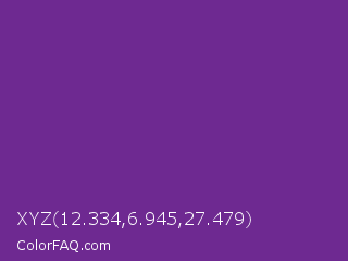 XYZ 12.334,6.945,27.479 Color is a normal purple color and the nearest color is Seance #731e8f. Hex code #6e2991 and RGB value is rgb(110,41,145). In RGB color space, this color is composed of 43% red, 16% green, 57% blue, In CMYK color space, this color is composed of 24% cyan, 72% magenta, 0% yellow , 43% black , In HSL color space, this color has a hue angle of 280° , 56% saturation and 36% lightness.