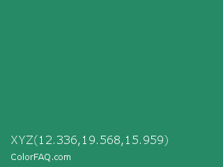 XYZ 12.336,19.568,15.959 Color is a normal green color and the nearest color is Eucalyptus #278a5b. Hex code #268a67 and RGB value is rgb(38,138,103). In RGB color space, this color is composed of 15% red, 54% green, 40% blue, In CMYK color space, this color is composed of 72% cyan, 0% magenta, 25% yellow , 46% black , In HSL color space, this color has a hue angle of 159° , 57% saturation and 35% lightness.