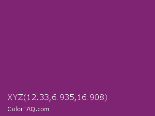 XYZ 12.33,6.935,16.908 Color is a normal magenta color and the nearest color is Midnight #702670. Hex code #7e2473 and RGB value is rgb(126,36,115). In RGB color space, this color is composed of 49% red, 14% green, 45% blue, In CMYK color space, this color is composed of 0% cyan, 71% magenta, 9% yellow , 51% black , In HSL color space, this color has a hue angle of 307° , 56% saturation and 32% lightness.