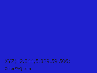XYZ 12.344,5.829,59.506 Color is a normal blue color and the nearest color is Interdimensional Blue #360ccc. Hex code #1f20cf and RGB value is rgb(31,32,207). In RGB color space, this color is composed of 12% red, 13% green, 81% blue, In CMYK color space, this color is composed of 85% cyan, 85% magenta, 0% yellow , 19% black , In HSL color space, this color has a hue angle of 240° , 74% saturation and 47% lightness.
