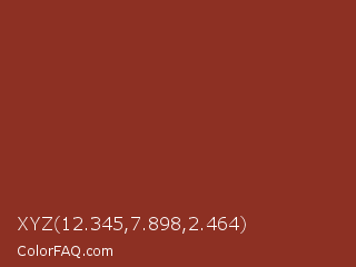 XYZ 12.345,7.898,2.464 Color is a normal red color and the nearest color is Burnt Umber #8a3324. Hex code #8d3023 and RGB value is rgb(141,48,35). In RGB color space, this color is composed of 55% red, 19% green, 14% blue, In CMYK color space, this color is composed of 0% cyan, 66% magenta, 75% yellow , 45% black , In HSL color space, this color has a hue angle of 7° , 60% saturation and 35% lightness.
