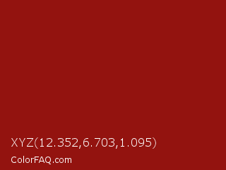 XYZ 12.352,6.703,1.095 Color is a normal red color and the nearest color is Tamarillo #991613. Hex code #93130f and RGB value is rgb(147,19,15). In RGB color space, this color is composed of 58% red, 7% green, 6% blue, In CMYK color space, this color is composed of 0% cyan, 87% magenta, 90% yellow , 42% black , In HSL color space, this color has a hue angle of 2° , 81% saturation and 32% lightness.