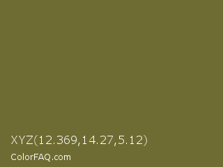 XYZ 12.369,14.27,5.12 Color is a normal yellow color and the nearest color is Yellow Metal #716338. Hex code #6e6c32 and RGB value is rgb(110,108,50). In RGB color space, this color is composed of 43% red, 42% green, 20% blue, In CMYK color space, this color is composed of 0% cyan, 2% magenta, 55% yellow , 57% black , In HSL color space, this color has a hue angle of 58° , 38% saturation and 31% lightness.