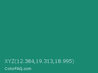 XYZ 12.384,19.313,18.995 Color is a normal cyan color and the nearest color is Elm #1c7c7d. Hex code #198972 and RGB value is rgb(25,137,114). In RGB color space, this color is composed of 10% red, 54% green, 45% blue, In CMYK color space, this color is composed of 82% cyan, 0% magenta, 17% yellow , 46% black , In HSL color space, this color has a hue angle of 168° , 69% saturation and 32% lightness.