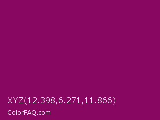XYZ 12.398,6.271,11.866 Color is a dark magenta color and the nearest color is Cardinal Pink #8c055e. Hex code #880861 and RGB value is rgb(136,8,97). In RGB color space, this color is composed of 53% red, 3% green, 38% blue, In CMYK color space, this color is composed of 0% cyan, 94% magenta, 29% yellow , 47% black , In HSL color space, this color has a hue angle of 318° , 89% saturation and 28% lightness.