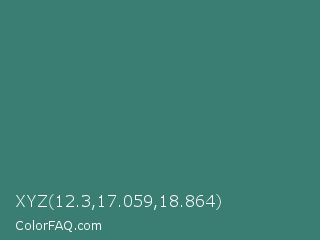XYZ 12.3,17.059,18.864 Color is a normal cyan color and the nearest color is Viridian #40826d. Hex code #3a7e73 and RGB value is rgb(58,126,115). In RGB color space, this color is composed of 23% red, 49% green, 45% blue, In CMYK color space, this color is composed of 54% cyan, 0% magenta, 9% yellow , 51% black , In HSL color space, this color has a hue angle of 170° , 37% saturation and 36% lightness.