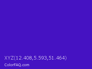 XYZ 12.408,5.593,51.464 Color is a normal indigo color and the nearest color is Interdimensional Blue #360ccc. Hex code #4512c2 and RGB value is rgb(69,18,194). In RGB color space, this color is composed of 27% red, 7% green, 76% blue, In CMYK color space, this color is composed of 64% cyan, 91% magenta, 0% yellow , 24% black , In HSL color space, this color has a hue angle of 257° , 83% saturation and 42% lightness.