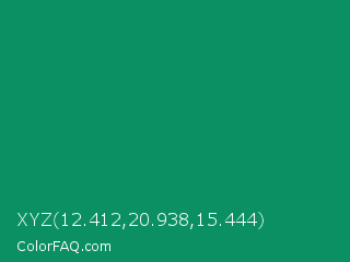 XYZ 12.412,20.938,15.444 Color is a dark green color and the nearest color is Green Cyan #009966. Hex code #0b9064 and RGB value is rgb(11,144,100). In RGB color space, this color is composed of 4% red, 56% green, 39% blue, In CMYK color space, this color is composed of 92% cyan, 0% magenta, 31% yellow , 44% black , In HSL color space, this color has a hue angle of 160° , 86% saturation and 30% lightness.