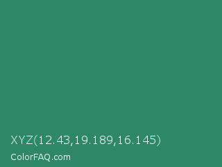 XYZ 12.43,19.189,16.145 Color is a normal green color and the nearest color is Eucalyptus #278a5b. Hex code #2e8868 and RGB value is rgb(46,136,104). In RGB color space, this color is composed of 18% red, 53% green, 41% blue, In CMYK color space, this color is composed of 66% cyan, 0% magenta, 24% yellow , 47% black , In HSL color space, this color has a hue angle of 159° , 49% saturation and 36% lightness.