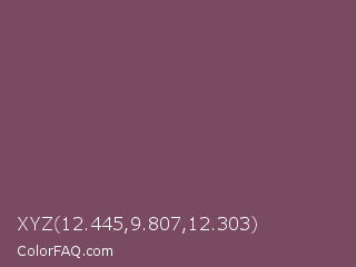 XYZ 12.445,9.807,12.303 Color is a normal rose color and the nearest color is Deep Ruby #843f5b. Hex code #794a60 and RGB value is rgb(121,74,96). In RGB color space, this color is composed of 47% red, 29% green, 38% blue, In CMYK color space, this color is composed of 0% cyan, 39% magenta, 21% yellow , 53% black , In HSL color space, this color has a hue angle of 332° , 24% saturation and 38% lightness.