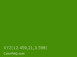 XYZ 12.459,21,3.598 Color is a dark green color and the nearest color is Avocado #568203. Hex code #478f07 and RGB value is rgb(71,143,7). In RGB color space, this color is composed of 28% red, 56% green, 3% blue, In CMYK color space, this color is composed of 50% cyan, 0% magenta, 95% yellow , 44% black , In HSL color space, this color has a hue angle of 92° , 91% saturation and 29% lightness.