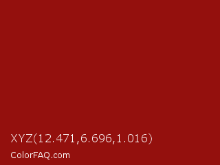 XYZ 12.471,6.696,1.016 Color is a normal red color and the nearest color is Tamarillo #991613. Hex code #94100d and RGB value is rgb(148,16,13). In RGB color space, this color is composed of 58% red, 6% green, 5% blue, In CMYK color space, this color is composed of 0% cyan, 89% magenta, 91% yellow , 42% black , In HSL color space, this color has a hue angle of 1° , 84% saturation and 32% lightness.