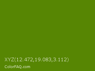 XYZ 12.472,19.083,3.112 Color is a dark green color and the nearest color is Avocado #568203. Hex code #578603 and RGB value is rgb(87,134,3). In RGB color space, this color is composed of 34% red, 53% green, 1% blue, In CMYK color space, this color is composed of 35% cyan, 0% magenta, 98% yellow , 47% black , In HSL color space, this color has a hue angle of 82° , 96% saturation and 27% lightness.