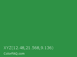 XYZ 12.48,21.568,9.136 Color is a normal green color and the nearest color is Sea Green #2e8b57. Hex code #2e9245 and RGB value is rgb(46,146,69). In RGB color space, this color is composed of 18% red, 57% green, 27% blue, In CMYK color space, this color is composed of 68% cyan, 0% magenta, 53% yellow , 43% black , In HSL color space, this color has a hue angle of 134° , 52% saturation and 38% lightness.