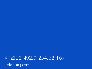 XYZ 12.492,9.254,52.167 Color is a normal blue color and the nearest color is Sapphire #0f52ba. Hex code #084dc2 and RGB value is rgb(8,77,194). In RGB color space, this color is composed of 3% red, 30% green, 76% blue, In CMYK color space, this color is composed of 96% cyan, 60% magenta, 0% yellow , 24% black , In HSL color space, this color has a hue angle of 218° , 92% saturation and 40% lightness.