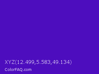 XYZ 12.499,5.583,49.134 Color is a normal violet color and the nearest color is Interdimensional Blue #360ccc. Hex code #4d0dbe and RGB value is rgb(77,13,190). In RGB color space, this color is composed of 30% red, 5% green, 75% blue, In CMYK color space, this color is composed of 59% cyan, 93% magenta, 0% yellow , 25% black , In HSL color space, this color has a hue angle of 262° , 87% saturation and 40% lightness.