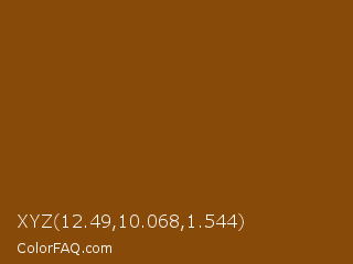 XYZ 12.49,10.068,1.544 Color is a dark orange color and the nearest color is Korma #8f4b0e. Hex code #874a09 and RGB value is rgb(135,74,9). In RGB color space, this color is composed of 53% red, 29% green, 4% blue, In CMYK color space, this color is composed of 0% cyan, 45% magenta, 93% yellow , 47% black , In HSL color space, this color has a hue angle of 31° , 88% saturation and 28% lightness.