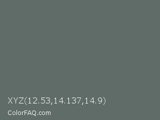 XYZ 12.53,14.137,14.9 Color is a normal green color and the nearest color is Corduroy #606e68. Hex code #5f6c67 and RGB value is rgb(95,108,103). In RGB color space, this color is composed of 37% red, 42% green, 40% blue, In CMYK color space, this color is composed of 12% cyan, 0% magenta, 5% yellow , 58% black , In HSL color space, this color has a hue angle of 157° , 6% saturation and 40% lightness.