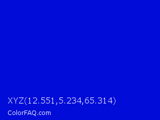 XYZ 12.551,5.234,65.314 Color is a normal blue color and the nearest color is Medium Blue #0000cd. Hex code #020cd8 and RGB value is rgb(2,12,216). In RGB color space, this color is composed of 1% red, 5% green, 85% blue, In CMYK color space, this color is composed of 99% cyan, 94% magenta, 0% yellow , 15% black , In HSL color space, this color has a hue angle of 237° , 98% saturation and 43% lightness.
