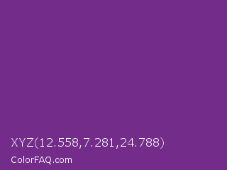 XYZ 12.558,7.281,24.788 Color is a normal purple color and the nearest color is Eminence #6c3082. Hex code #732c8a and RGB value is rgb(115,44,138). In RGB color space, this color is composed of 45% red, 17% green, 54% blue, In CMYK color space, this color is composed of 17% cyan, 68% magenta, 0% yellow , 46% black , In HSL color space, this color has a hue angle of 285° , 52% saturation and 36% lightness.