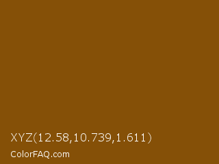 XYZ 12.58,10.739,1.611 Color is a dark orange color and the nearest color is Rusty Nail #86560a. Hex code #855007 and RGB value is rgb(133,80,7). In RGB color space, this color is composed of 52% red, 31% green, 3% blue, In CMYK color space, this color is composed of 0% cyan, 40% magenta, 95% yellow , 48% black , In HSL color space, this color has a hue angle of 35° , 90% saturation and 27% lightness.