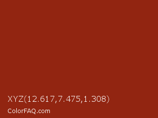 XYZ 12.617,7.475,1.308 Color is a normal red color and the nearest color is Kobe #882d17. Hex code #922511 and RGB value is rgb(146,37,17). In RGB color space, this color is composed of 57% red, 15% green, 7% blue, In CMYK color space, this color is composed of 0% cyan, 75% magenta, 88% yellow , 43% black , In HSL color space, this color has a hue angle of 9° , 79% saturation and 32% lightness.