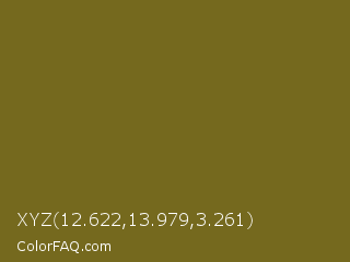 XYZ 12.622,13.979,3.261 Color is a dark yellow color and the nearest color is Olivetone #716e10. Hex code #75691e and RGB value is rgb(117,105,30). In RGB color space, this color is composed of 46% red, 41% green, 12% blue, In CMYK color space, this color is composed of 0% cyan, 10% magenta, 74% yellow , 54% black , In HSL color space, this color has a hue angle of 52° , 59% saturation and 29% lightness.
