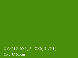 XYZ 12.631,21.086,3.721 Color is a dark green color and the nearest color is Vida Loca #549019. Hex code #498f0b and RGB value is rgb(73,143,11). In RGB color space, this color is composed of 29% red, 56% green, 4% blue, In CMYK color space, this color is composed of 49% cyan, 0% magenta, 92% yellow , 44% black , In HSL color space, this color has a hue angle of 92° , 86% saturation and 30% lightness.