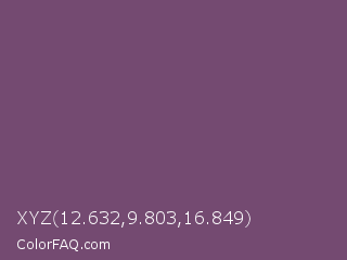 XYZ 12.632,9.803,16.849 Color is a normal magenta color and the nearest color is Twilight Lavender #8a496b. Hex code #744a71 and RGB value is rgb(116,74,113). In RGB color space, this color is composed of 45% red, 29% green, 44% blue, In CMYK color space, this color is composed of 0% cyan, 36% magenta, 3% yellow , 55% black , In HSL color space, this color has a hue angle of 304° , 22% saturation and 37% lightness.