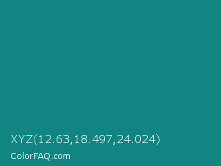 XYZ 12.63,18.497,24.024 Color is a dark cyan color and the nearest color is Metallic Seaweed #0a7e8c. Hex code #108582 and RGB value is rgb(16,133,130). In RGB color space, this color is composed of 6% red, 52% green, 51% blue, In CMYK color space, this color is composed of 88% cyan, 0% magenta, 2% yellow , 48% black , In HSL color space, this color has a hue angle of 178° , 79% saturation and 29% lightness.