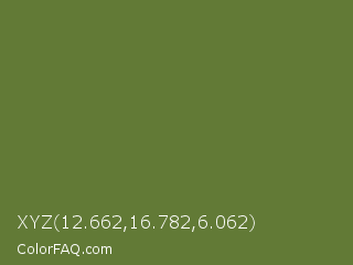 XYZ 12.662,16.782,6.062 Color is a normal green color and the nearest color is Dingley #5d7747. Hex code #627a36 and RGB value is rgb(98,122,54). In RGB color space, this color is composed of 38% red, 48% green, 21% blue, In CMYK color space, this color is composed of 20% cyan, 0% magenta, 56% yellow , 52% black , In HSL color space, this color has a hue angle of 81° , 39% saturation and 35% lightness.