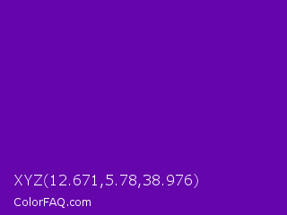 XYZ 12.671,5.78,38.976 Color is a normal purple color and the nearest color is Purple #660099. Hex code #6406ab and RGB value is rgb(100,6,171). In RGB color space, this color is composed of 39% red, 2% green, 67% blue, In CMYK color space, this color is composed of 42% cyan, 96% magenta, 0% yellow , 33% black , In HSL color space, this color has a hue angle of 274° , 93% saturation and 35% lightness.