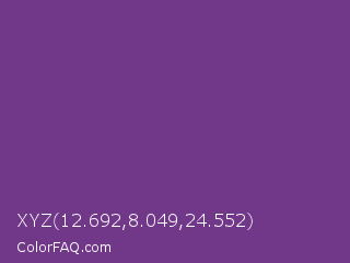 XYZ 12.692,8.049,24.552 Color is a normal purple color and the nearest color is Maximum Purple #733380. Hex code #713789 and RGB value is rgb(113,55,137). In RGB color space, this color is composed of 44% red, 22% green, 54% blue, In CMYK color space, this color is composed of 18% cyan, 60% magenta, 0% yellow , 46% black , In HSL color space, this color has a hue angle of 282° , 43% saturation and 38% lightness.