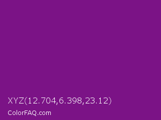 XYZ 12.704,6.398,23.12 Color is a dark magenta color and the nearest color is Seance #731e8f. Hex code #7b1386 and RGB value is rgb(123,19,134). In RGB color space, this color is composed of 48% red, 7% green, 53% blue, In CMYK color space, this color is composed of 8% cyan, 86% magenta, 0% yellow , 47% black , In HSL color space, this color has a hue angle of 294° , 75% saturation and 30% lightness.