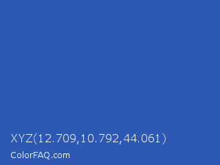 XYZ 12.709,10.792,44.061 Color is a normal blue color and the nearest color is Cerulean Blue #2a52be. Hex code #2d58b3 and RGB value is rgb(45,88,179). In RGB color space, this color is composed of 18% red, 35% green, 70% blue, In CMYK color space, this color is composed of 75% cyan, 51% magenta, 0% yellow , 30% black , In HSL color space, this color has a hue angle of 221° , 60% saturation and 44% lightness.