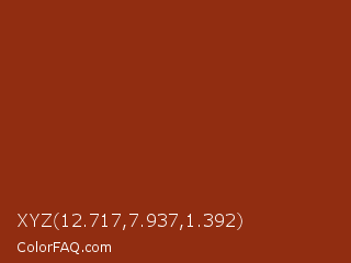 XYZ 12.717,7.937,1.392 Color is a normal red color and the nearest color is Kobe #882d17. Hex code #912d11 and RGB value is rgb(145,45,17). In RGB color space, this color is composed of 57% red, 18% green, 7% blue, In CMYK color space, this color is composed of 0% cyan, 69% magenta, 88% yellow , 43% black , In HSL color space, this color has a hue angle of 13° , 79% saturation and 32% lightness.