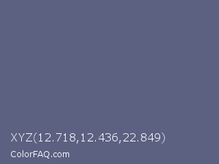 XYZ 12.718,12.436,22.849 Color is a normal blue color and the nearest color is Comet #5c5d75. Hex code #5c6182 and RGB value is rgb(92,97,130). In RGB color space, this color is composed of 36% red, 38% green, 51% blue, In CMYK color space, this color is composed of 29% cyan, 25% magenta, 0% yellow , 49% black , In HSL color space, this color has a hue angle of 232° , 17% saturation and 44% lightness.