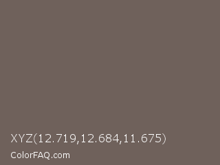 XYZ 12.719,12.684,11.675 Color is a normal orange color and the nearest color is Coffee #706555. Hex code #6f615b and RGB value is rgb(111,97,91). In RGB color space, this color is composed of 44% red, 38% green, 36% blue, In CMYK color space, this color is composed of 0% cyan, 13% magenta, 18% yellow , 56% black , In HSL color space, this color has a hue angle of 18° , 10% saturation and 40% lightness.